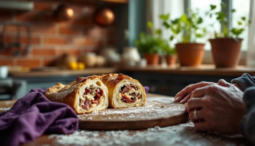 Su una spianatoia leggermente infarinata, stendete l'impasto in un rettangolo di circa 40x30 cm con uno spessore di 1,5 cm. Distribuite uniformemente i cubetti di salame napoletano, i ciccioli ben scolati dal loro grasso in eccesso, il pecorino e il provolone piccante. Mantenete un bordo libero di circa 2 cm su tutti i lati per evitare che il ripieno fuoriesca durante la cottura. Arrotolate l'impasto su sé stesso nel senso della lunghezza, formando un cilindro compatto, e pizzicate bene le estremità per sigillarle.