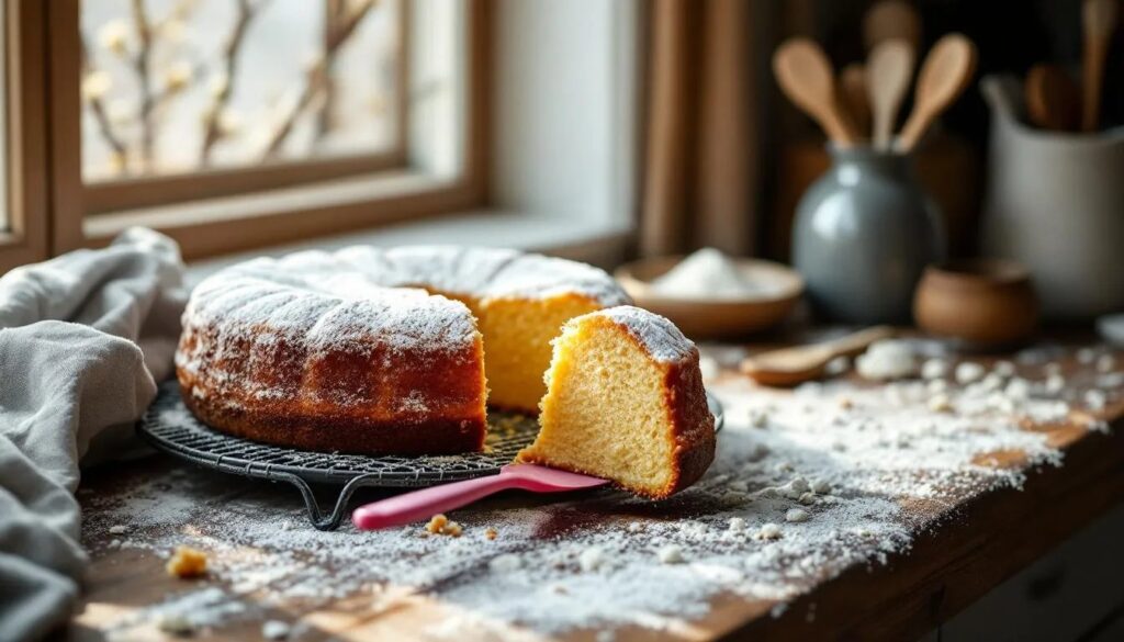 Dopo 40 minuti, infilate uno stuzzicadenti nel punto più alto della ciambella: deve uscire asciutto, con tutt'al più qualche briciola umida attaccata, mai con impasto crudo. La superficie sarà dorata in modo uniforme, con la crepa centrale più scura e profumata. Sfornate e lasciate raffreddare nello stampo per 10 minuti, poi sformate su una gratella: non direttamente su un piatto, perché il vapore rimanente inumidirebbe il fondo. Attendete il raffreddamento completo prima di tagliare — almeno un'ora — altrimenti la mollica, ancora calda e umida, si comprimerà sotto il coltello. Spolverate con zucchero a velo solo al momento di servire.