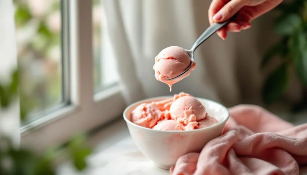 Estraete il gelato dal freezer 5–8 minuti prima di servirlo: questo breve riposo a temperatura ambiente ammorbidisce leggermente la struttura e rende più facile la formatura con il cucchiaio da gelato. La texture corretta si riconosce al tatto della cucchiaiata: la superficie cede con resistenza moderata, la pallina mantiene la forma senza sfaldarsi, il colore è rosa vivo. Servite in coppette o coni.