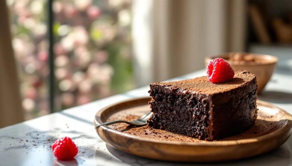 Estraete lo stampo dal forno e lasciate raffreddare la torta al suo interno per almeno venti minuti prima di sformarla. La struttura interna ha bisogno di questo tempo per stabilizzarsi: se la rovesciate troppo presto, il centro potrebbe cedere. Una volta intiepidita, trasferitela su una gratella e lasciatela raffreddare completamente. La superficie presenterà una leggera spaccatura centrale — normale, caratteristica, segno di una lievitazione corretta. Potete servire la torta liscia, spolverata di cacao amaro, o glassarla con una ganache di cioccolato fondente fuso con latte di cocco.